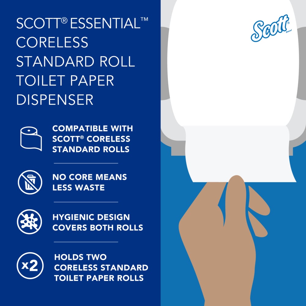 • 1 Scott® Coreless Standard Roll Toilet Paper Dispenser/Case; White; 2 Roll Capacity; 11.0" x 7.63" x 6.0"