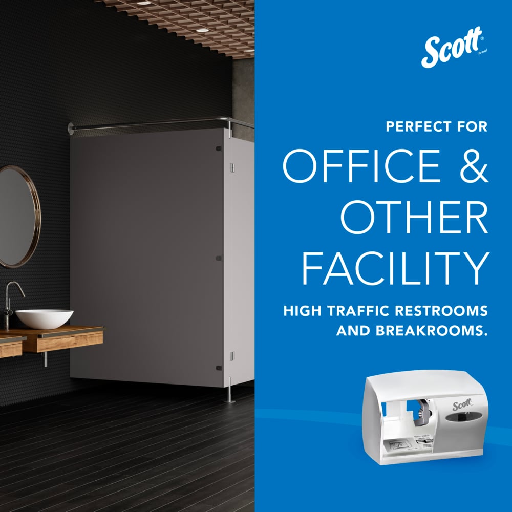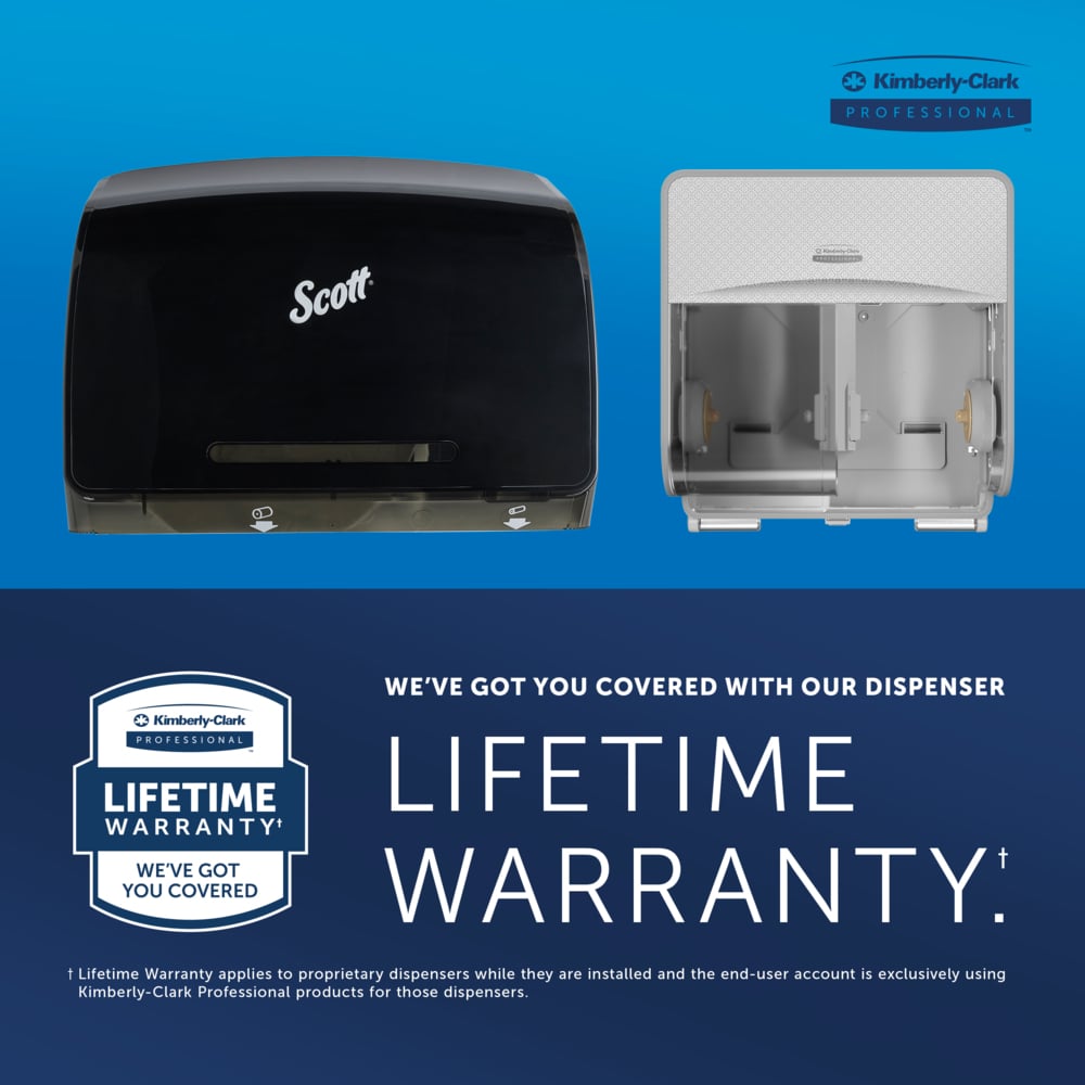 Scott® provides reliable balance of efficiency, performance and value. As a business owner, you want to make restroom maintenance as easy and fast as possible. The Scott® Coreless Standard Roll Toilet Paper Dispenser is available in a two roll configuration as well as a high capacity four roll configuration. The dispenser is durable and has a sleek, professional look. By using coreless toilet paper rolls you'll have less waste (up to 47% less packaging waste vs. standard roll tissue) and you can get up to 15% more paper per case (comparing coreless to like cored products). Refilling was designed to be easy for your maintenance staff. When properly installed and when using recommended product, the dispenser meets the ADA Standards for Accessible Design. Look for compatible standard roll toilet paper from Scott®. After all, you have better things to do than worry about refilling toilet paper! This dispenser is backed by a lifetime warranty and is designed to save you time and money while reducing service disruptions and user complaints.