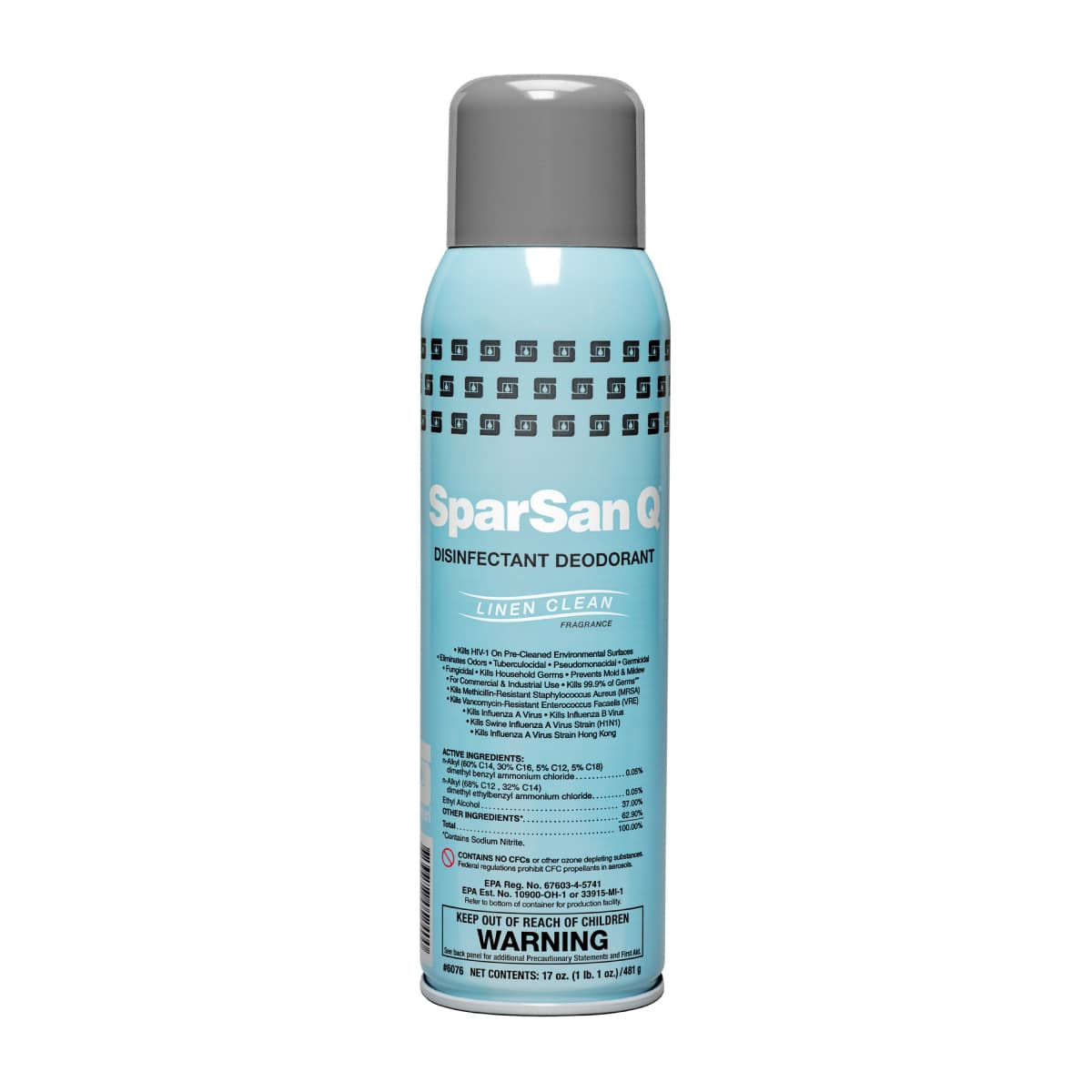 SparSan Q Disinfectant Deodorant is a versatile, ready-to-use aerosol disinfectant deodorant. It is ideal for convenient disinfection after spot clean up, and for those areas not easily reached during routine disinfection procedures. Prevents mold and mildew on environmental surfaces in public places. Meets EPA Efficacy Standards for hospital aerosol disinfectants.