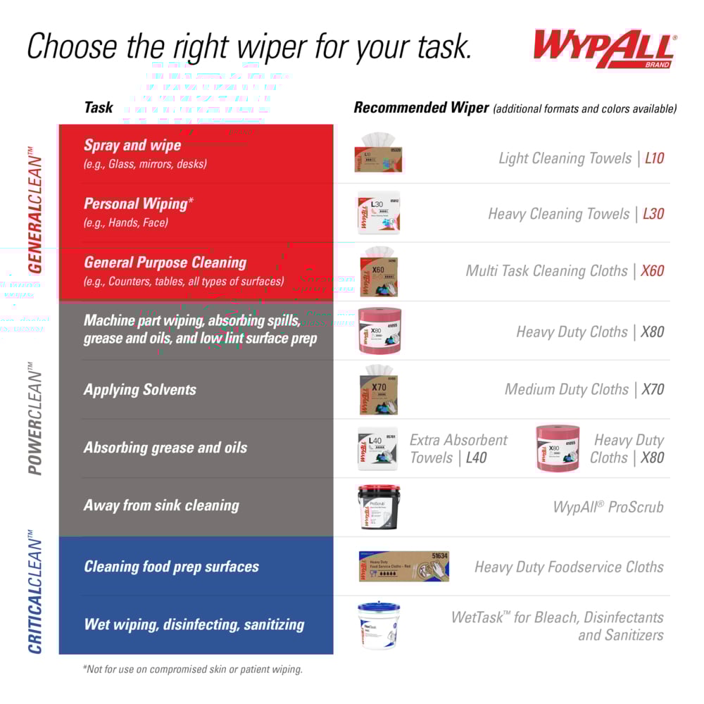 WypAll® is the number one brand of disposable wipes in the US and Canada. Maximize performance while minimizing time, effort and product waste. WypAll® PowerClean™ X80 Heavy Duty Cloths feature innovations like high-tech Hydroknit® fast-absorbing material and are durable for scrubbing. These contaminant-free commercial cloths are a favorite replacement for industrial cloth towels, which can harbor dangerous chemicals, such as lead (In a 2003 Gradient study, 100% of the sampled laundered shop towels tested, lead was detected at levels that may exceed health based exposure guidelines.). WypAll® PowerClean™ X80 Heavy Duty Cloths are made of soft pulp fibers, bonded to a polypropylene base sheet for absorbency and durability, making them suitable for removing dirt, oil, grime and solvents in industrial and manufacturing businesses. The reusable cloths are reinforced for strength when wet and dry. These bulk cloths are a great alternative – safer and more efficient – to replace laundered rental shop towels or and cleaning towels. Use them for heavy duty machine- and part-wiping, wiping metal shavings, prepping surfaces with solvents and cleaning rough surfaces. After all, every business gets dirty. But for the toughest grease and grime, you can trust WypAll® PowerClean™ X80 Heavy Duty Cloths.